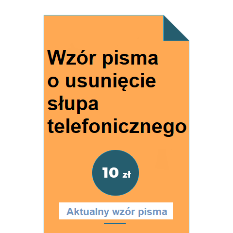 Jak napisać pismo o usunięcie słupa telefonicznego? aby dokument spełnił szereg formalnych wymagań, powinny się w nim znaleźć wszystkie niezbędne dla tego typu pism elementy. Pismo o usunięcie słupa telefonicznego jest dokumentem dość wymagającym dlatego, aby ułatwić Ci sporządzenie takiego pisma, przygotowaliśmy gotowy do pobrania i wypełnienia wzór pisma o usunięcie słupa telefonicznego.